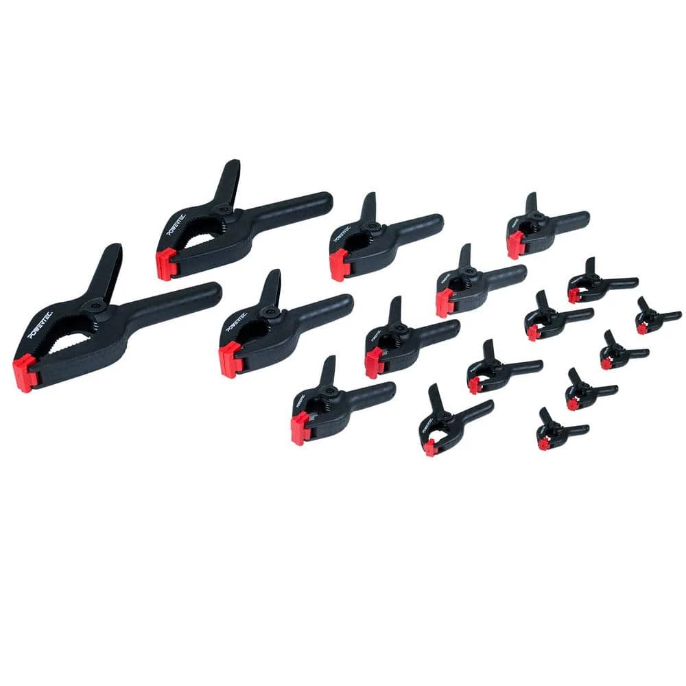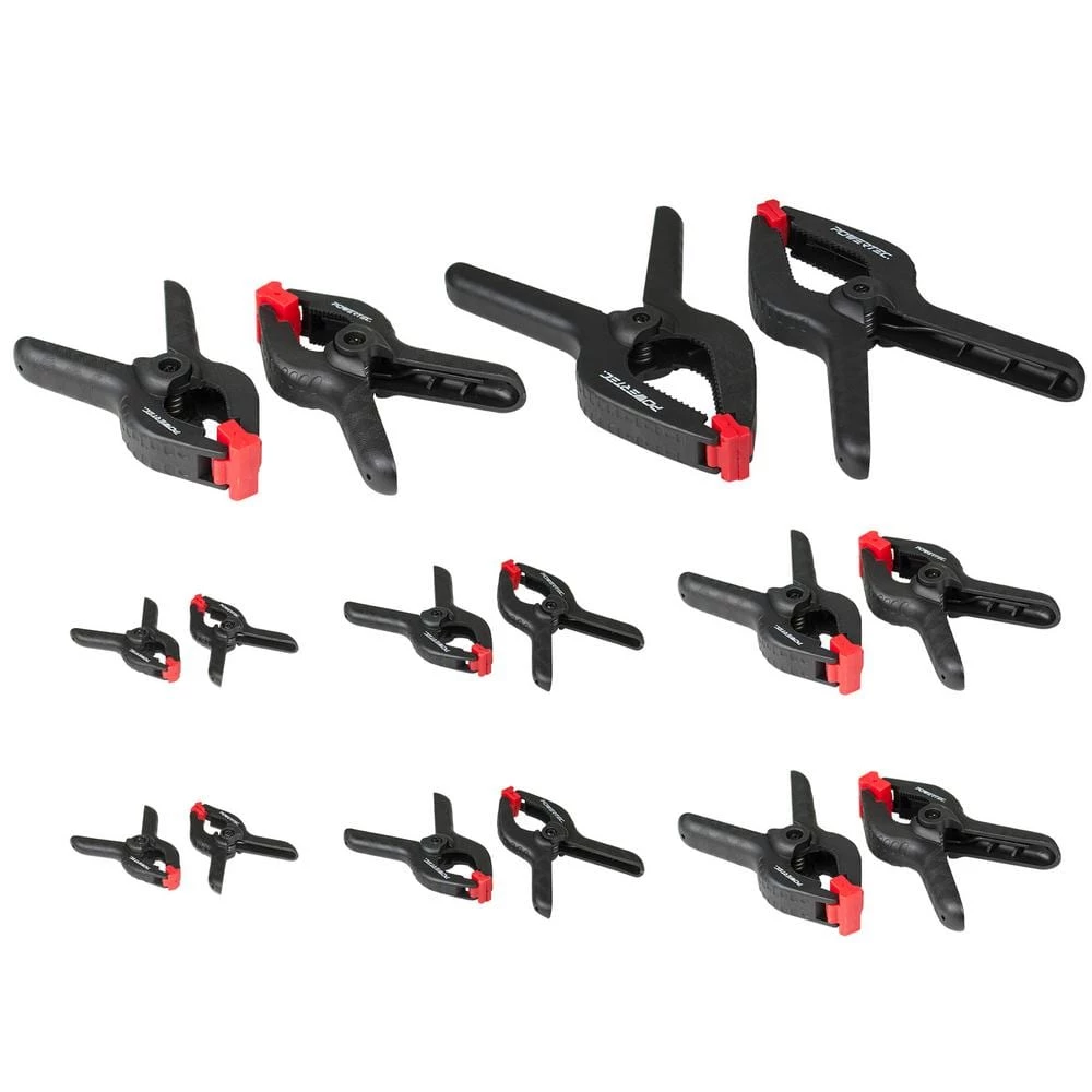 Convenient and versatile, the POWERTEC 71087 Spring Clamp Assortment Set is a comprehensive selection of the most popularly utilized clamp sizes, ideal for use in a multitude of home, workshop and studio projects. Constructed of premium reinforced nylon for the utmost in durability. High-utility spring clamping-mechanism offers a secure and dependable hold. Pivoting and pliable gripping pads customize to your workpiece and wont damage stock surfaces. These efficient extra hands help insure the user a more streamlined workflow, thus enhancing project outcomes and worker satisfaction. This essential set is comprised of the following: 2 each of the【 9 in. capacity clamps】body length: 8-7/8 in., jaw length: 9-1/8 in., jaw width: 3-1/2 in. 2 each of the【 6 in. capacity clamps】 (body length: 6 in., jaw length: 6-1/4 in., jaw width: 2-1/4 in. 4 each of the【 4-1/2 in. 】capacity clamps (body length: 4-1/4 in., jaw length: 4-1/2 in., jaw width: 1-5/8 in. 4 each of the 【3-5/16 in. 】capacity clamps (body length: 3-3/16 in., jaw length: 3-5/16 in., jaw width: 1-1/2 in.) 4 each of the 【2-3/8 in.】 capacity clamps body Length: 2-1/4 in., jaw length: 2-3/8 in., jaw width: 1-1/8 in.