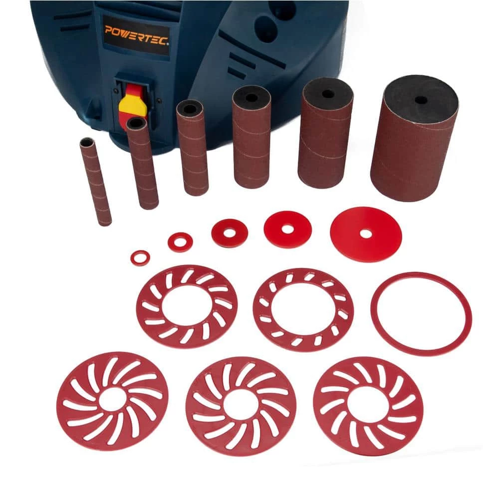 Introducing the 2.6 Amp Oscillating Spindle Sander Kit by POWERTEC. This spindle sander was designed to equip you with the proper woodworking tools ideal for sanding arcs, contours, curves and other irregular shapes. The sander uses a 2/5 HP induction motor that operates smoothly at approximately 30 strokes per minute on 4 rubber feet for reduced vibration to improve operational stability and comfort. This sander comes with round table inserts for sanding 90° to the spindle and slotted table inserts for angled sanding. Oscillating action reduces friction heat to protect wood and prolong sleeve life. The sander table top is round, providing ample coverage for different sized and shaped projects. Its cast iron construction helps deliver long-term durability and sturdy top that you can depend on. The onboard storage features side rod and disc slots that provide plenty of storage for a wide assortment of sanding disc and drums. For the everyday woodworking enthusiast that juggles multiple projects at 1 time, it also comes equipped with a built-in dust collection exhaust port to connect your shop vac allowing you to work unencumbered and with a workspace clean and free of dust and debris. Specs Induction Motor: 2/5 HP, 2.6 Amps at 1725 RPM/Power Cord: 120-Volt Spindle Stroke: 5/8 in. Spindle Speed: 30 SPM/Cast Iron Table: 14 in. Dia Spindle diameter: 1/2 in. Drum Length: 4-1/2 in.