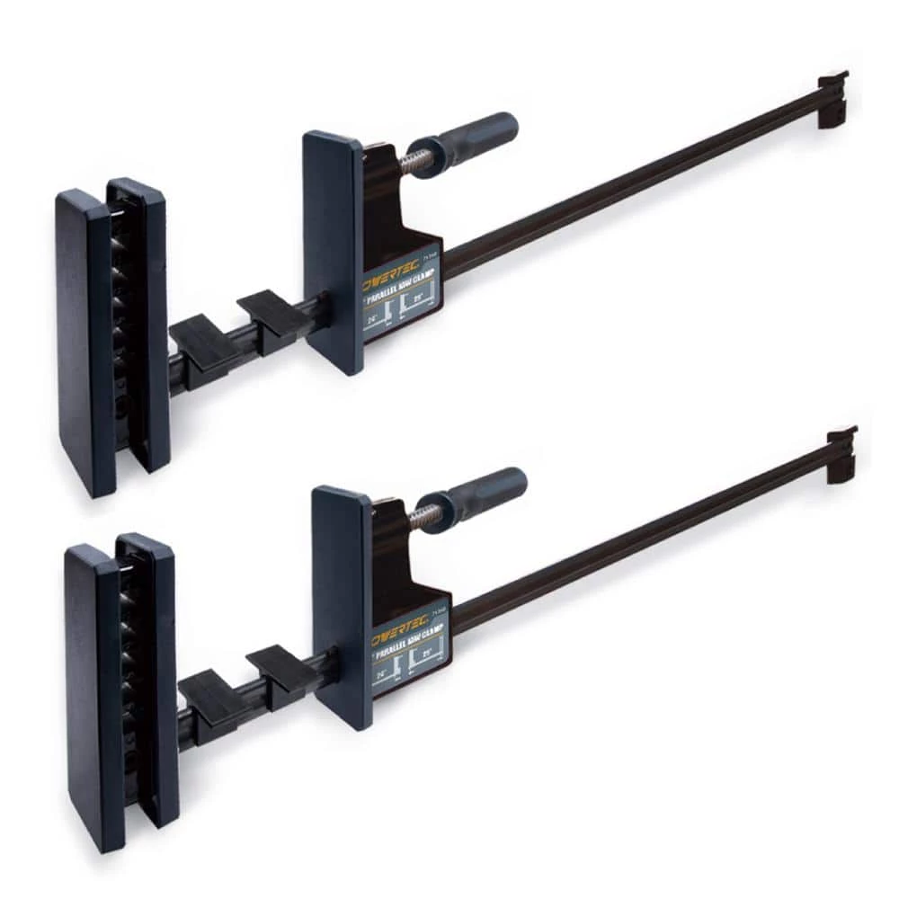 Introducing the 24 in. Parallel Jaw Bar Clamp Set by POWERTEC. These premium bar clamps are designed to provide optimal clamping force at a parallel (90°) angle for many of your carpentry and woodworking applications. They are ideal for anyone requiring general purpose clamping of wood, glue up panels, tables or other material. Showcasing a durable lightweight design, these handy clamping tools possess highly impressive specs and an assortment of useful features, including: – Ergonomic soft grip handles / – Cold steel rail construction with snap on plastic protectors / – Removable steel reinforced jaws for proper pressure distribution / – 880 lbs. clamping force capacity / – Removable end rail clip / – Built-in clamp stand for one-handed usability / – Quick adjustment sliding clamps with pressure release / – Easy-to-convert 29 in. Spreader Tool