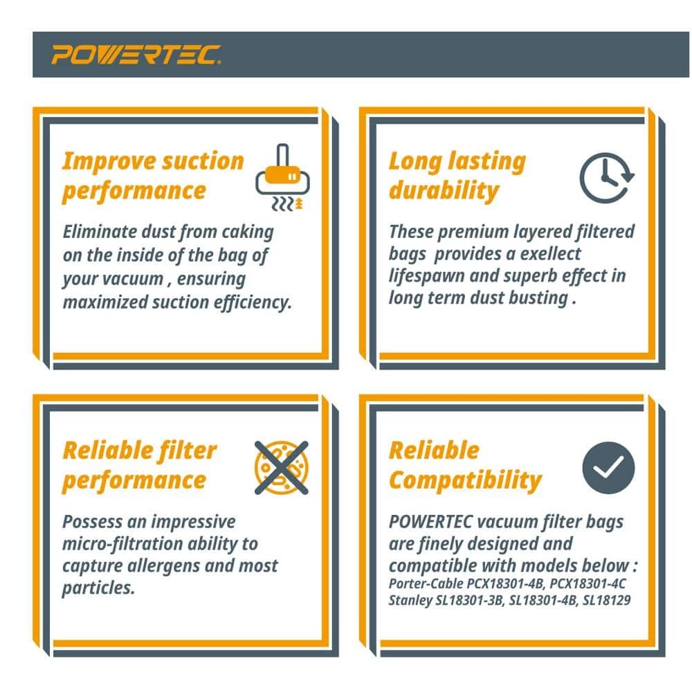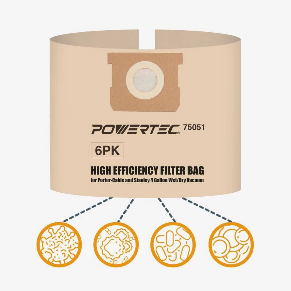 Introducing the Replacement Filter Bags intended for Porter Cable/Stanley Disposable by POWERTEC. These high efficiency filter bags were specifically designed to fit Porter Cable and Stanley 4 Gal. Wet/Dry Vacuums (see models below). They are fully disposable and can be disconnected with ease – offering exceptional convenience when the job is completed or the bag is entirely full. Whether you’ve created a small or big mess, these bags will help keep your shop and work area clean, enabling you to experience a smooth and consistent workflow (the most important thing for any professional on a schedule). Please Note: Our filter bags perform at an optimal level when used for dry pickup and collecting various types of dirt, dust and debris. Package Contains: 6 Filter Bags Compatible With: Porter Cable Wet Dry 4 Gal. Models PCX18301-4B PCX18301-4C Stanley Wet Dry Vac 4 Gal. Models SL18301-3B SL18301-4B SL18129 POWERTEC is a leading manufacturer of high quality woodworking tools and accessories, machines and an assortment of OEM replacement parts. We are committed to exceeding expectations, while bringing the latest innovations, technology and product development to the industry.