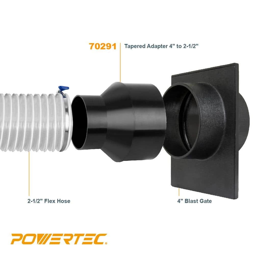 Introducing the 4 in. to 2-1/2 in. Tapered Reducer Adapter by POWERTEC. This adapter is uniquely designed to attach a 2-1/2 in. ID dust collection hose directly to a 4 in. OD machine port. The adapter uses a friction fit to fit inside the 4 in. port without the need of cuffs or couplers, making a quick disconnect that can be used for multiple machine setups. Featuring a tapered design, this unique adapter/reducer sits firmly inside your fittings and possesses a small and large end – both with tapered profiles intended to give you a no-nonsense fit for your dust collection hoses and components. 2-1/2 in. Nominal OD End (tapers from 2.45 in. – 2.49 in.) to deliver a precise connection for a 2-1/2 in. ID dust hose. 4 in. End uniquely designed to fit inside a nominal 4 in. port or fitting (tapers from 3.51 in. – 3.73 in.) to produce an accurate connection for a 4 in. dust collection port without the need of cuffs or couplers. Durable Construction – Premium Design, This reducer is made out of black ABS plastic, perfect for withstanding the wear and tear commonly associated with workshop sawdust and wood chip dust collection. It is extremely easy to install and offers a simple twist to either secure or break a connection. This reducer does not require any additional cuffs, clamps, splices or adapters. PLEASE NOTE, We recommend that you check the dimensions of your port and hoses to confirm that this reducer adapter will fit your application before ordering.