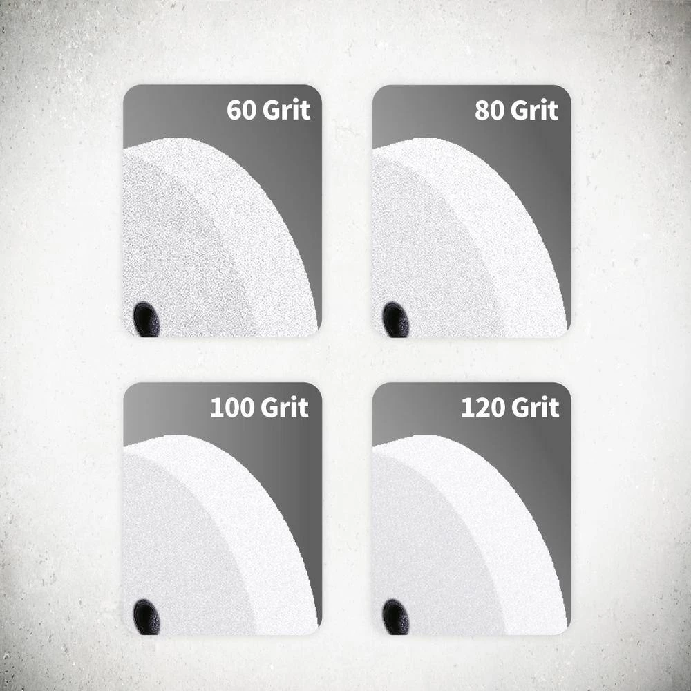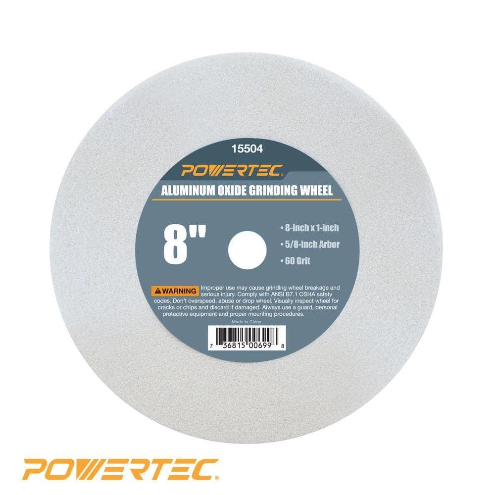 Style:60 Grit. Introducing the Aluminum Oxide Grinding Wheel by POWERTEC? This 8″ bench grinder wheel was designed to fit most stationary bench grinding machines for high-speed steel sharpening and deburring. It features premium white aluminum oxide with a vitrified bond. As this abrasive grinds down with wear, it produces a consistent and fresh grinding surface for balanced work. Whether sharpening your metal lathe turning tools, lawnmower blades or other HSS tools – this grinding wheel stone will get the job done with high precision results. Commonly Used Applications: Lawn mower blade sharpening tool; Metal lathe tool sharpening; Sharpening HSS drill bits; Planer blade sharpener; Chisel sharpening tool; (It is not recommended that you grind wood, plastic or any other non-metallic material on a bench or pedestal grinder.) Dimensions and Specifications: Diameter: 8″.Thickness: 1″.Arbor size: 5/8″.Material: White Aluminum Oxide (Alundum).Bond: Vitrified.Grit Type: 60. Maximum RPM: 3600. The wheel’s superior, premium-vitrified BOND construction means you get the surface you need for the toughest grinding applications. These top-quality, potent wheels won’t de-temper your valuable tools because they cut fast and Cool, thereby minimizing tool loss and maximizing grinding-assembly performance.