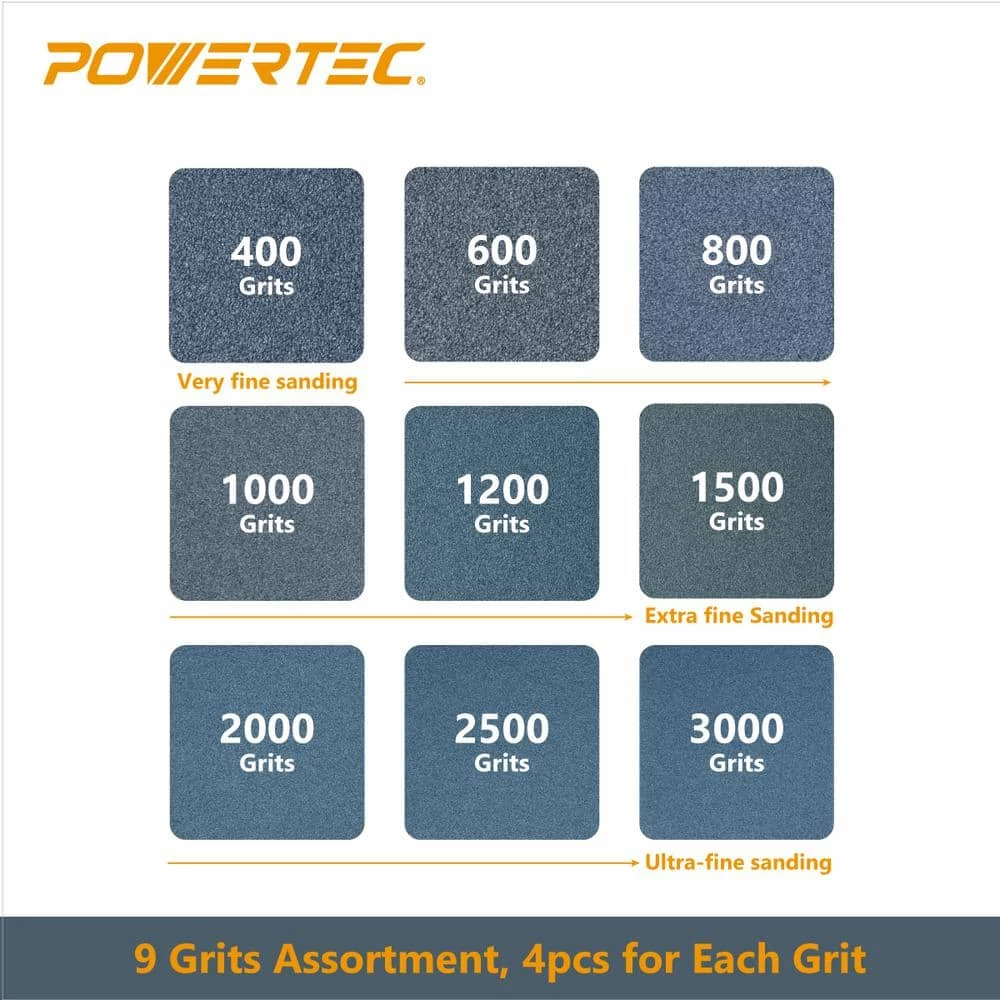 You’ll have everything you need for flawless surfacing and polishing right at your fingertips – with the POWERTEC Wet/Dry Sandpaper with Assorted-grits, 9 in. x 3.6 in., 36-Pack, 4 each of 400-grits/600-grits/800-grits/1000-grits/1200-grits/1500-grits/2000-grits/2500-grits/3000-grits. This package features a collection of 9 grade grits, and a total of 36 assorted grit sandpaper sheets – ensuring that you have a full spectrum to choose from for any project. Offering the latest in abrasive technology, this premium paper with its silicon-carbide construction and electro-coating assures you fast and uniform cutting for both wet and dry use.【 Please Note: These sand paper sheet are for sanding purposes only and work well with plastic, metal, porcelain, or wooden surfaces. It’s compatible with most sand blocks and can be used exclusively by hand.】//Sheet Size: 9″ x 3.6″.//Package Includes: (4 Sheets Each Grade)-400 Grit Sandpaper, 600 Grit Sandpaper, 800 Grit Sandpaper, 1000 Grit Sandpaper, 1200 Grit Sandpaper, 1500 Grit Sandpaper, 2000 Grit Sandpaper, 2500 Grit Sandpaper, 3000 Grit Sandpaper. //GRIT APPLICATIONS: 400 – 800 for pre-painted finishes., 1000 – 1500 for extra fine sanding between coats., 2000 – 3000 for ultra fine buffing.//