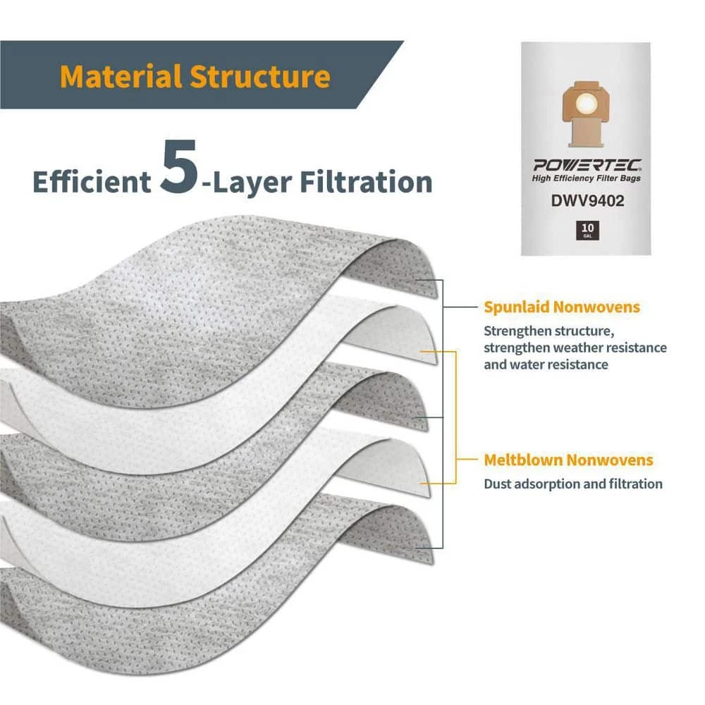 POWERTEC Self-Cleaning Fleece Filter Bags are the ideal solution for the optimal effective and hassle-free fine dust collection in your home or professional workshop. Cleaner fresher air and tidier workroom surfaces are a cinch to achieve with these durable and high-performing filter bags. The HEPA Style fleece construction is tear resistant and possesses a unique pliability, which insures that any dust and debris that cakes on its inner filtering surface will automatically slough off. This continuous and automatic fine-particle shedding insures optimal filtering action, even when the bag itself is virtually at full dust-holding capacity, thus insuring peak performance at all stages of the bag’s fullness. With their stellar filtering capacity, these indispensable bags successfully trap dust, debris, allergens and other particulate matter, up to 99.97% of particles. An auto-close bag feature prevents unnecessary mess and clean up. Also because your filtering bag is efficient and effective throughout its use, it won’t negatively impact the running of your dust collector itself. Compromised filtering execution that can occur in more rigid filter bags can strain and stress your dust collector’s motor and cause premature motor burnout and because of the substantial filtering action of the fleece bags, your HEPA filter won’t have to work so hard, effectively maximizes the potency and lifespan of the HEPA filter as well. Comes in convenient 5-Pack. Compatible with DeWalt DWV9402.