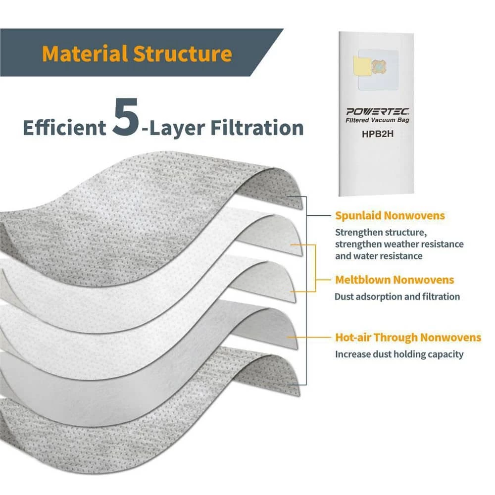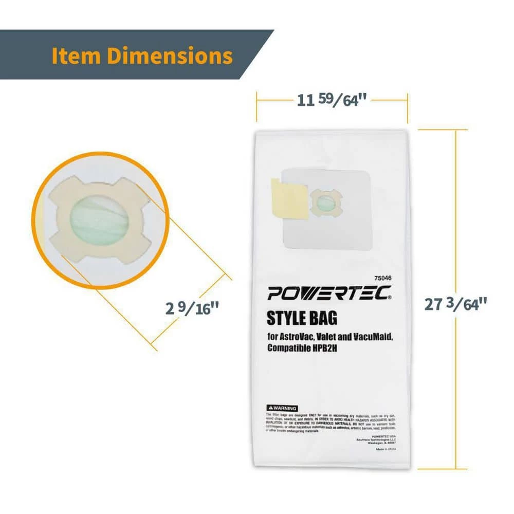Introducing the Filter Bags by POWERTEC Whether installed on your wall mounted shop vac or centralized vacuum, capturing small debris and fine dust particles is essential to maintaining a clean, safe and healthy working environment. With these bags, no dirt will escape. Made with high quality fabric material. These easy to install bags are durable for long term use but won’t clog once full and are extremely easy to replace once full. Simply slide the cardboard/rubber seal over the bag inlet fitting and it’s back to perfectly sealed dust capturing. Replacement Bag Compatible with: Valet – ATQ300 Vacumaid – GV30 : GV50 : GV30PRO : GV50PRO AstroVac – H1P : P70 : SR36 : SR38 : SR52H : SR760 : P80 : H2 : P73 : P75 : MK-IP : MK-XXIIIBP (Also compatible with any central vacuum with an HPB1 paper bag.)