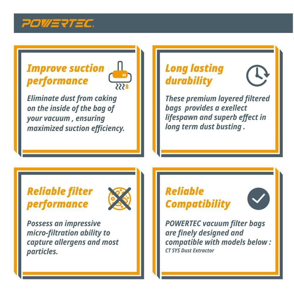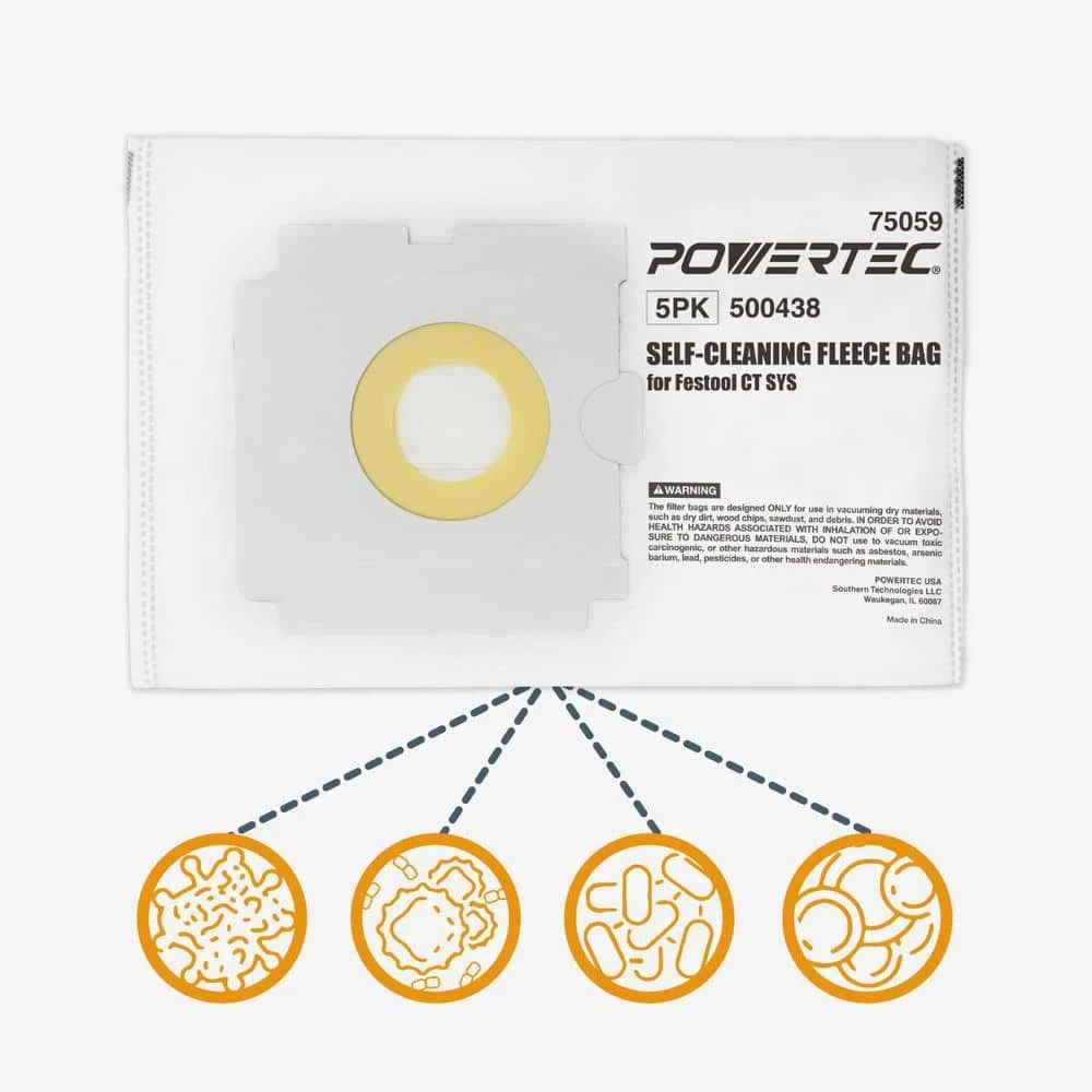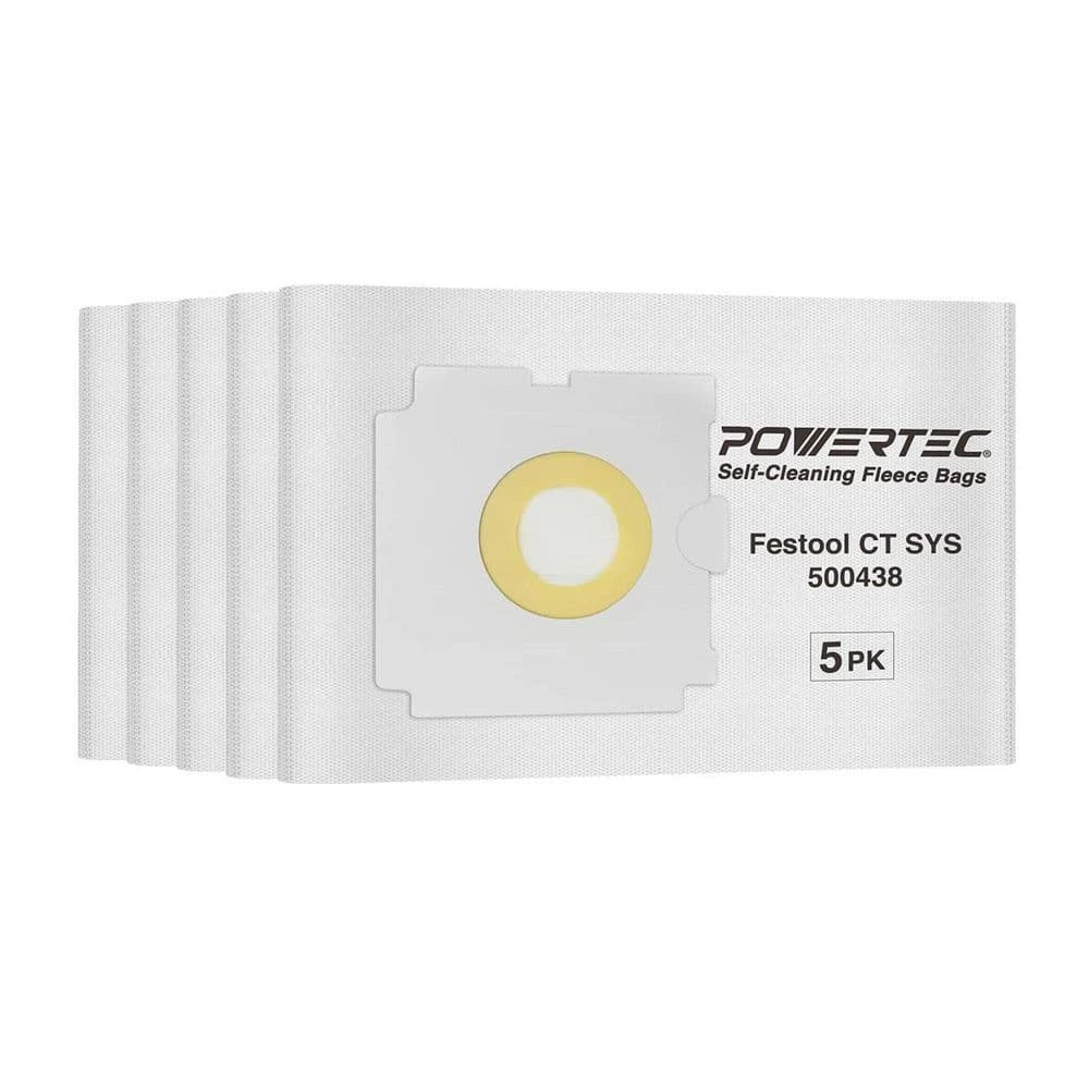 Introducing the Self Cleaning Festool CT SYS Filter Bags by POWERTEC. These vacuum and dust collector bags feature a unique self cleaning design meant to eliminate dust from caking on the inside of the bag of your Festool CT SYS shop vac, ensuring maximized suction efficiency until completely full. Additionally, each new CT SYS bag serves as a pre-filter and traps tiny dust particles down to 5 mic, giving your multiple layers of dust protection. High Quality Design Made with high quality fleece material, these 5-ply filtered bags deliver an impressive level of flexibility and a heavy-duty construction that wont rip or tear. The fleece material also provides long-lasting durability, helping to reduce the cost of constant bag replacement. These easy-to-install and dispose bags feature integrated closures that made a complete seal, preventing any spillage or leaking of fine dust particles. Compatibility CT SYS Dust Extractor.