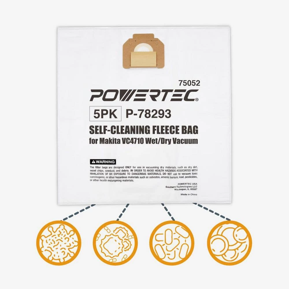 Introducing the Fleece Filter Bag Replacement for Makita VC4710 Wet/Dry Vac by POWERTEC. These professional grade self-cleaning filter bags are designed to provide you with a cost effective and hassle free alternative to replacing your high performance filters in your Makita VC4710 Extractor. Whether your at home or in a professional industrial setting, these POWERTEC originals are the perfect solution to collecting dust and debris and other pollutants with optimal results. 5-pack Made with tear resistant, 5-ply fleece cloth material, this replacement filter bag was designed with a HEPA style construction, ensuring that your equipped with a reliable particulate matter filter that safely and effectively captures dust, allergens and other fine particles (up to 99.97%). Did you know: Using standard Makita filter bags can cause a strain on your Makita Vacuum motor, resulting in premature burnout, decreased performance, and an increase in You purchasing more replacements. Our 12 Gal. nano filter bags prevent that. POWERTEC fleece HEPA filter bag acts as a long-lasting preliminary filtering screen for the Makita Dust Extractor filter, without impacting the performance of your vacuum, and provides you with double the amount of effectiveness in your dust extraction. Click the Add to Cart button today and save tomorrow.