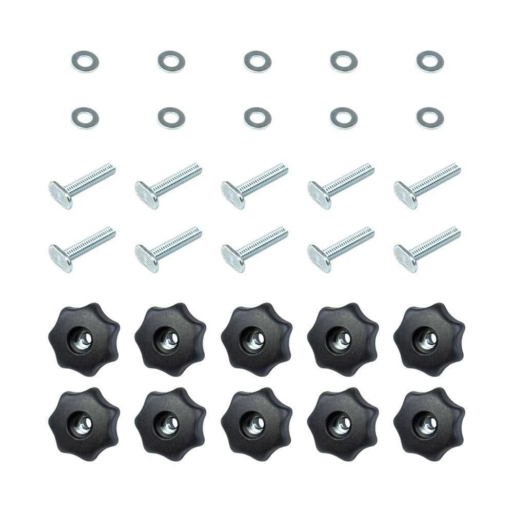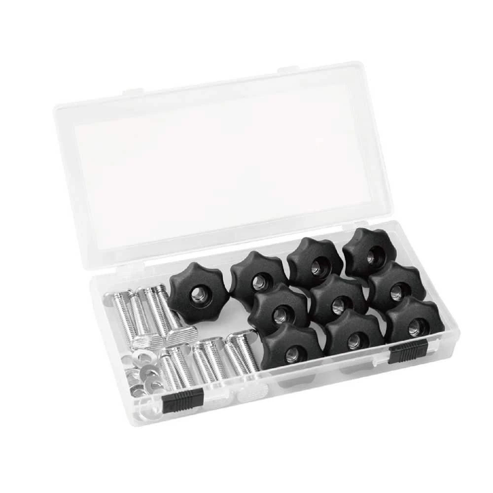 - Includes: (10) seven star knobs, (10) t-bolts, (10) washers and (1) storage case