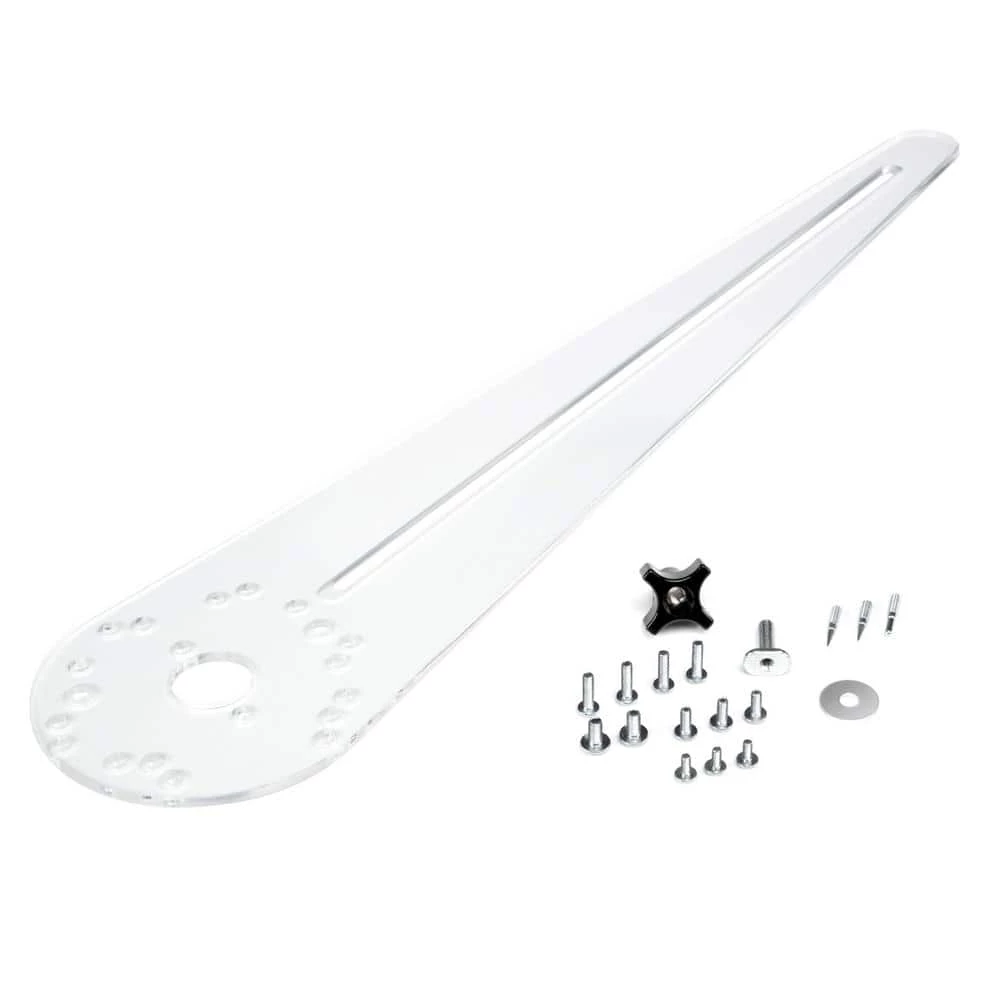 Introducing the Universal Pro Router Circle Cutting Jig by POWERTEC. This handy jig is intended to provide you with an easy-to-use and reliable tool for cutting perfect circles for many of your woodworking projects. With a cutting range of 10 in. (254 mm) to 53 in. (1346 mm) Dia, this circle cutting jig covers a wide spectrum of creative needs. POWERTEC 71637 comes with two center pins – one for applications where the user wants a center hole and the other where no viewable center hole is desired. A recessed groove in the jig lets you slide the center pivot pin up or down the length of the jig to find the correct, exact diameter of your circle. Although it possesses an impressively lightweight construction compared to similar jigs, it is made of acrylic. Our jig is equipped with pre-drilled hole patterns that make it easy to mount your existing routers. Bosch: 1617 Series (fixed base and plunge base), 1618 Series, MR23 Series Porter-Cable: 690, 7529, 8529 Makita: RF1101 Milwaukee: 5615, 5616, 5619 Hitachi: M8V, M-12VC, TR12 BONUS FEATURE: You can simply drill the necessary holes if the hole pattern doesn’t fit your model. Package Contains Easy to read manual, Router Compass Circle Jig, Insert Pins, 5/16 in.-18 T-bolt Pivot Pin, 5/16 in.-18 Thread 4-Star knob and Washer, (2) M6 x 1/2 in. Screws, (3) #10-24 x 1/2 in. Screws, (3) #8-32 x 3/8 in. Screws, (4) #10-32 x 3/4 in. screws.