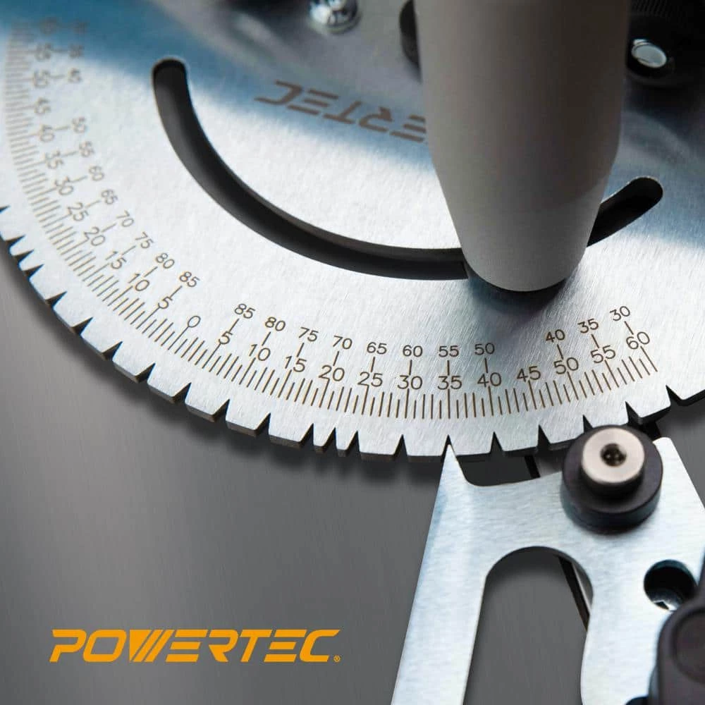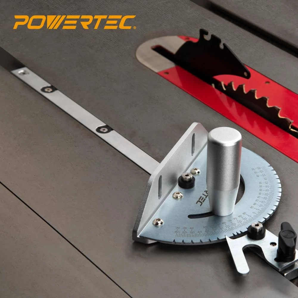 Introducing the Universal Table Saw Miter Gauge by POWERTEC. This compact, yet premium miter gauge is designed to provide you with a highly accurate and durable solution to your table saw angled cuts and cross cutting needs. It features positive stops at all common angles and flaunts a total of 27 lockable stops for high precision incremental control. UNIVERSAL COMPATIBILITY: It is designed to work with most standard table saws or machines with a 3/8 in. x 3/4 in. t-slot. This includes the POWERTEC line of power saws, along with other popular brands such as: Craftsman Delta Dewalt Grizzly Kreg and more. SUPERIOR ACCURACY: The positive stops are ideal for an assortment of woodworking projects – as they feature the angles more commonly used. Offering 27 lockable stops in 5 increments over an entire 180° range, this allows for plus or minus 60-range miter cuts. PLUS there are even more angled options that are clearly indexed (though not lockable) and easy to follow. HIGH QUALITY BUILD: Our miter gauge possesses a laser-cut aluminum construction with a light-weight design to ensure exceptional performance, accuracy and long-term durability. The large gauge handle bears an EZ-grip design for strength and comfort. The protractor head is bottom-coated with nylon for easy glide-ability. Additionally, the removable retainer plate prevents the miter bar from accidentally lifting or flipping when feeding your stock through.